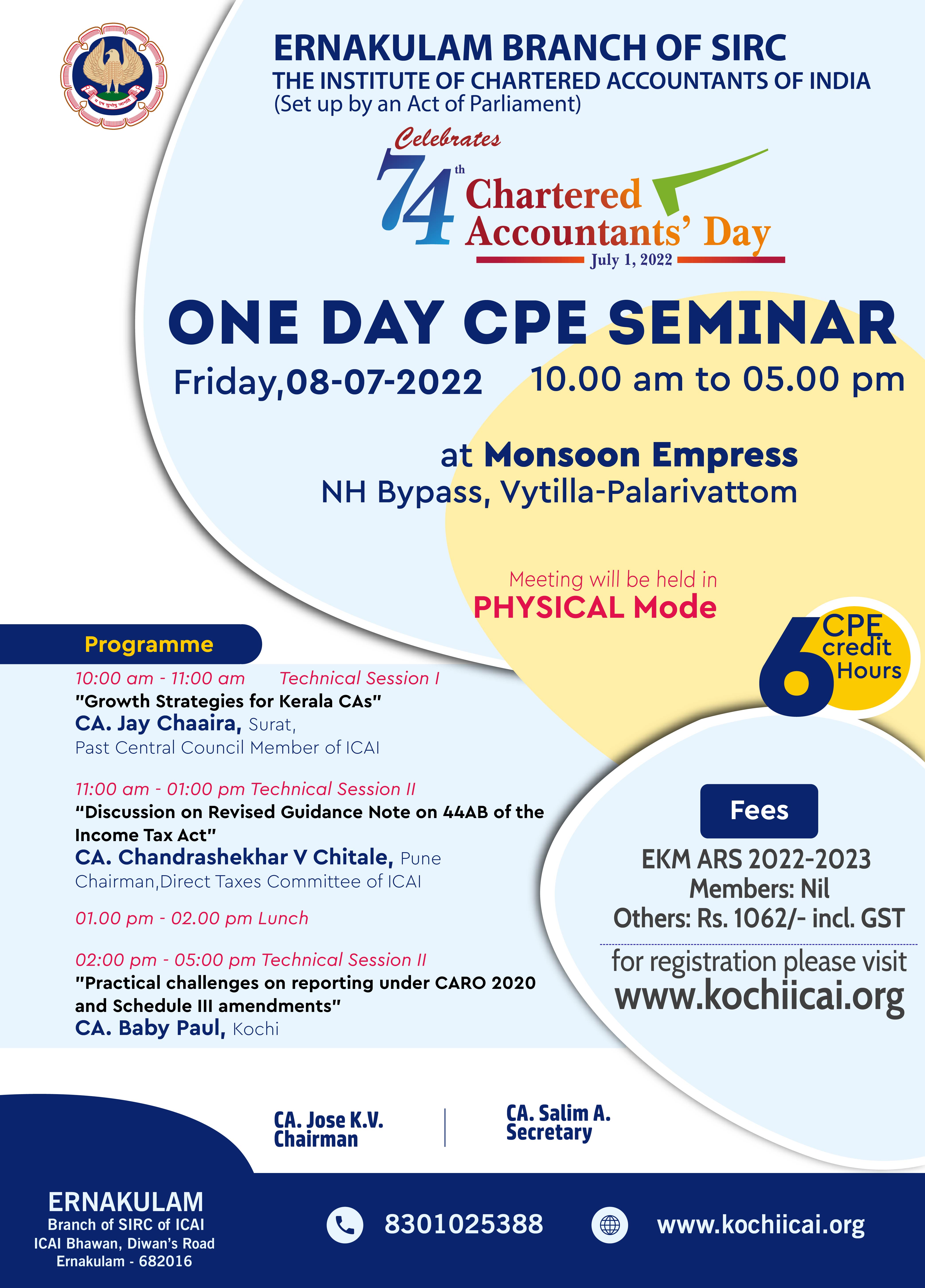 on 01 -07 -2022 CPE Credit: 0 Hours Venue: ICAI Bhawan, Diwan's Road,Ernakulam,Kerala