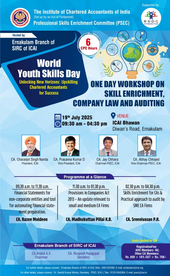 on 19 -07 -2025 CPE Credit: 6 Hours Venue: ICAI Bhawan, Diwan's Road,Ernakulam,Kerala