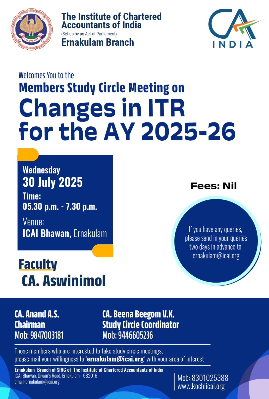 on 30 -07 -2025 CPE Credit: 0 Hours Venue: ICAI Bhawan, Diwan's Road,Ernakulam,Kerala