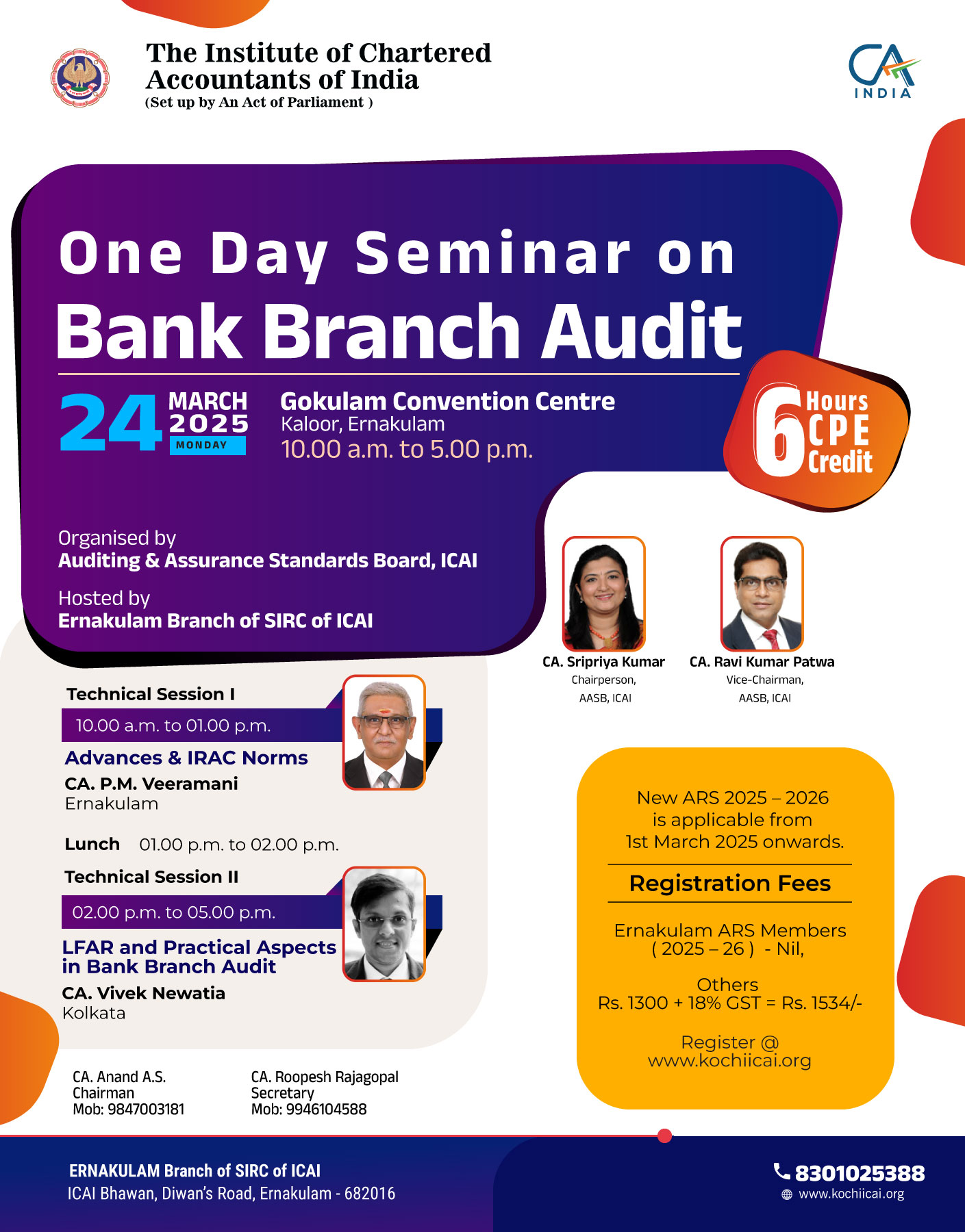 on 24 -03 -2025 CPE Credit: 6 Hours Venue: ICAI Bhawan, Diwan's Road,Ernakulam,Kerala