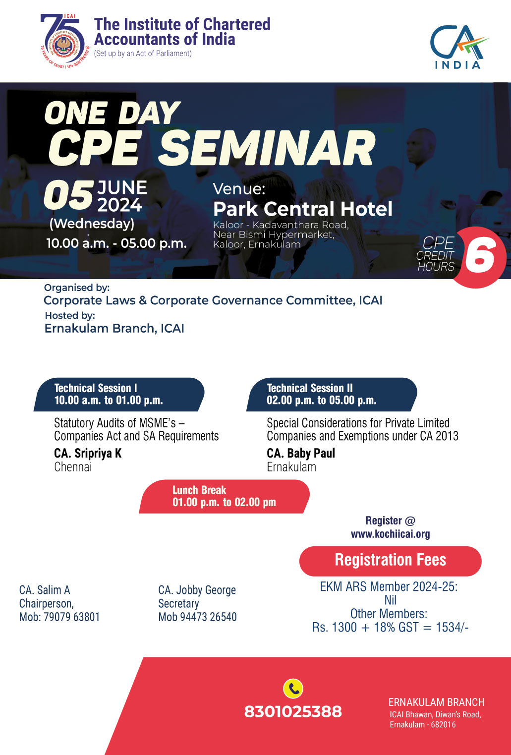 on 05 -06 -2024 CPE Credit: 6 Hours Venue: Hotel Park Central, Kaloor- Kadanvanthra Road, Kaloor, Ernakulam