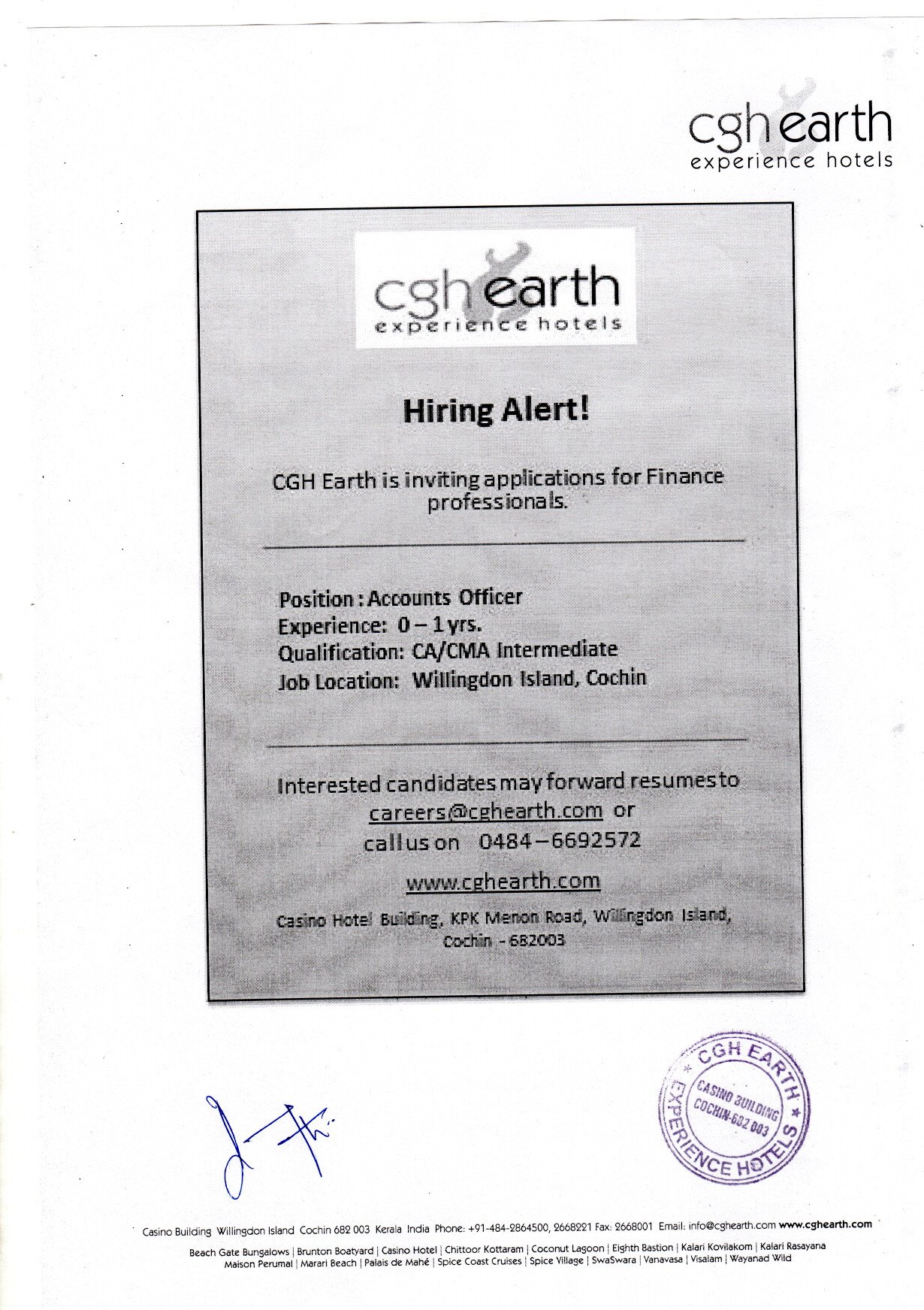 Accounts office for CGH earth Hotels Company: CGH Earth Hotels Students 1438 Views Company/Firm: CGH Earth Hotels Willington Island 0484-6692572 @ careers@cghearth.com Download File Category Students Share this Post