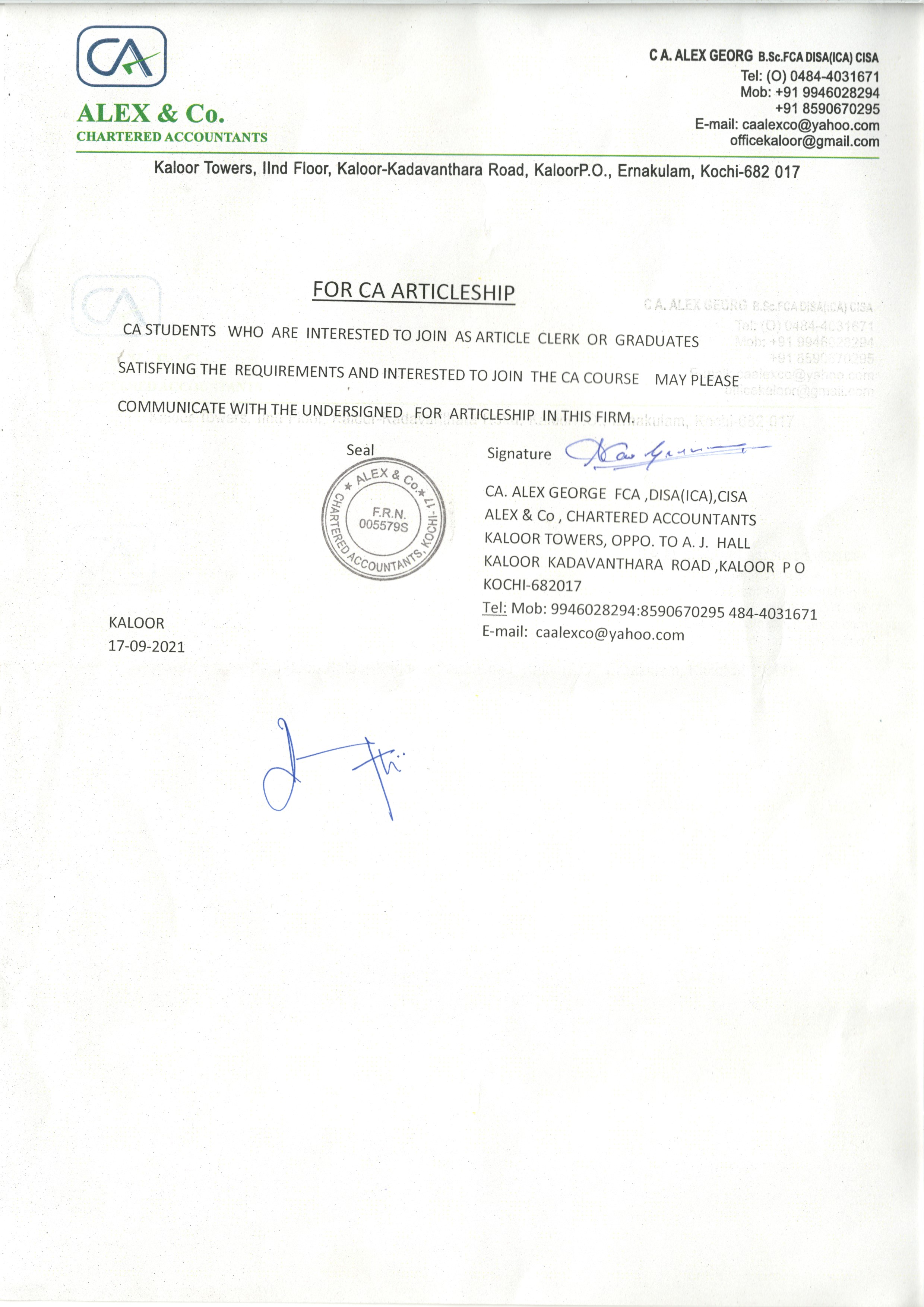 Articleship Vacancy Company: Alex & Co Members 1055 Views Company/Firm: Alex & Co Kaloor Towers, Opp. A.J Hall, Kaloor 9946028294 @ caalexco@yahoo.com Download File Category Members Share this Post