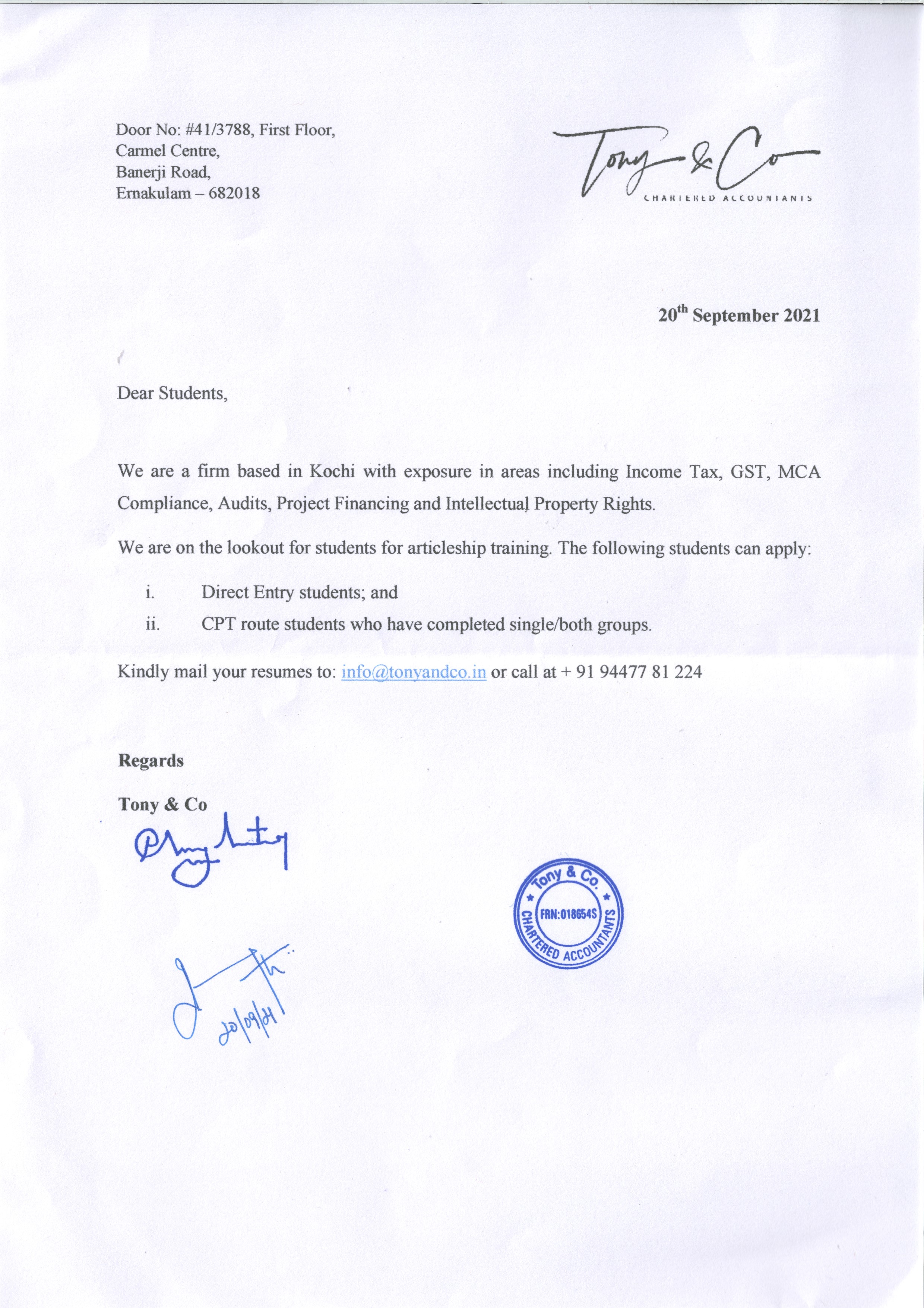 Vacancy for Articleship Company: Tony & Co Students 1126 Views Company/Firm: Tony & Co First Floor, Carmel Centre, Banerji Road, Ernakulam 9447781224 @ info@tonyandco.in Download File Category Students Share this Post