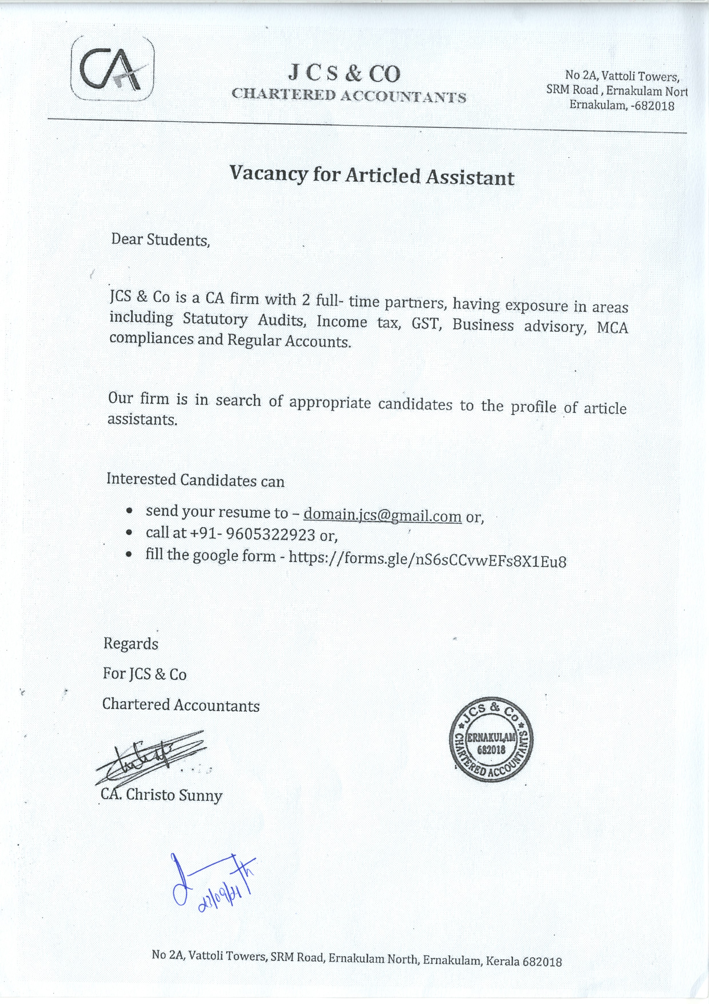 Vacancy for Articled Assistant Company: JCS & Co Students 1180 Views Company/Firm: JCS & Co Vattoli Towers, SRM Road, Ernakulam North 9605322923 @ domain.jcs@gmail.com Download File Category Students Share this Post