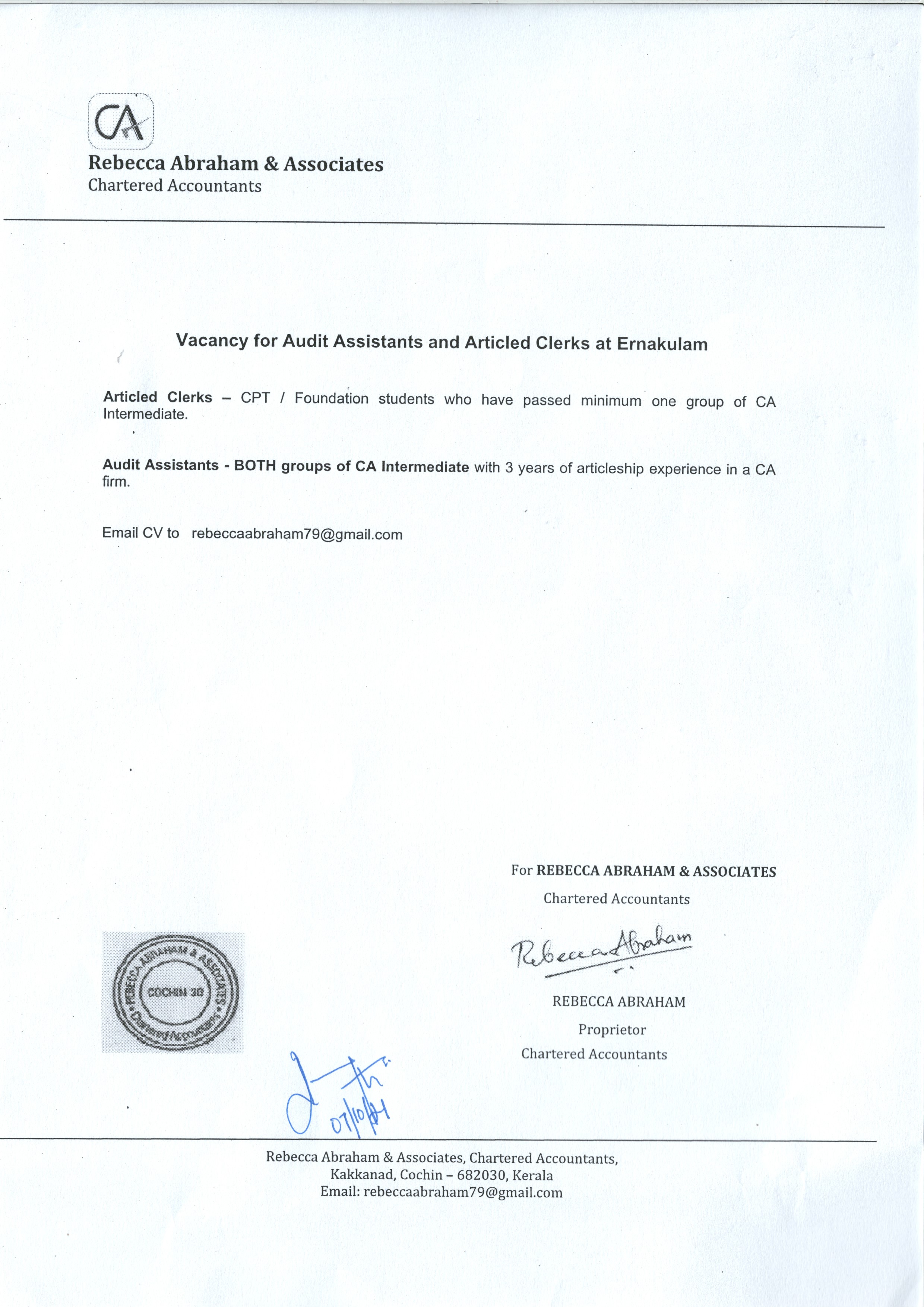 Vacancy for Audit Assistants and Articled Clerks Company: Rebecca Abraham Associates Students 1139 Views Company/Firm: Rebecca Abraham Associates @ rebeccaabraham79@gmail.com Download File Category Students Share this Post