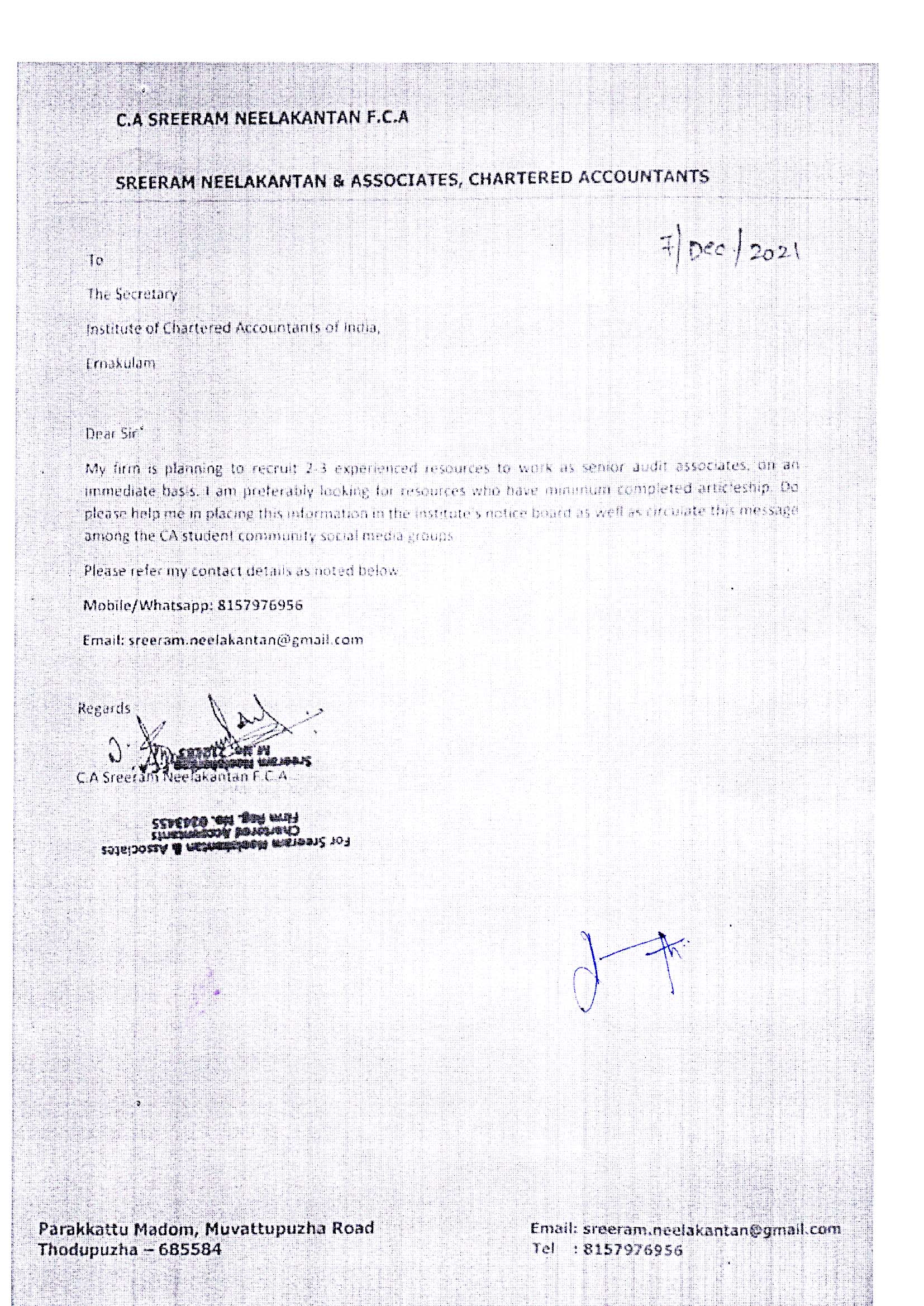 Vacancy for Senior Audit Associates Company: Sreeram Neelakantan & Associates Members 1621 Views Company/Firm: Sreeram Neelakantan & Associates Thodupuzha 8157976956 @ sreeram.neelakantan@gmail.com Download File Category Members Share this Post