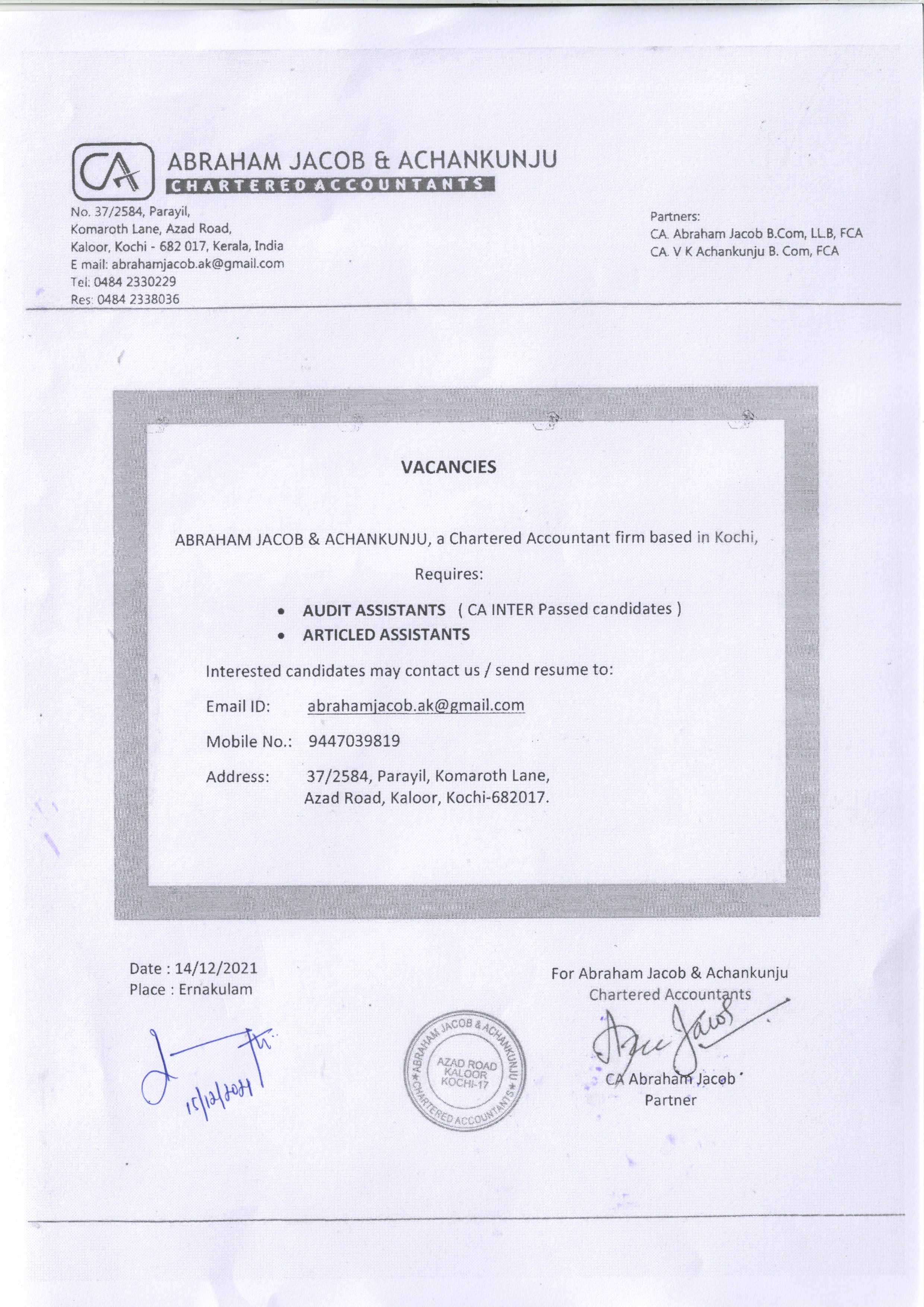 Vacancy for Articled Assistants and Audit assistants Company: Abraham Jacob & Achankunju Members 835 Views Company/Firm: Abraham Jacob & Achankunju 9447039819 @ abrahamjacob.ak@gmail.com Download File Category Members Share this Post