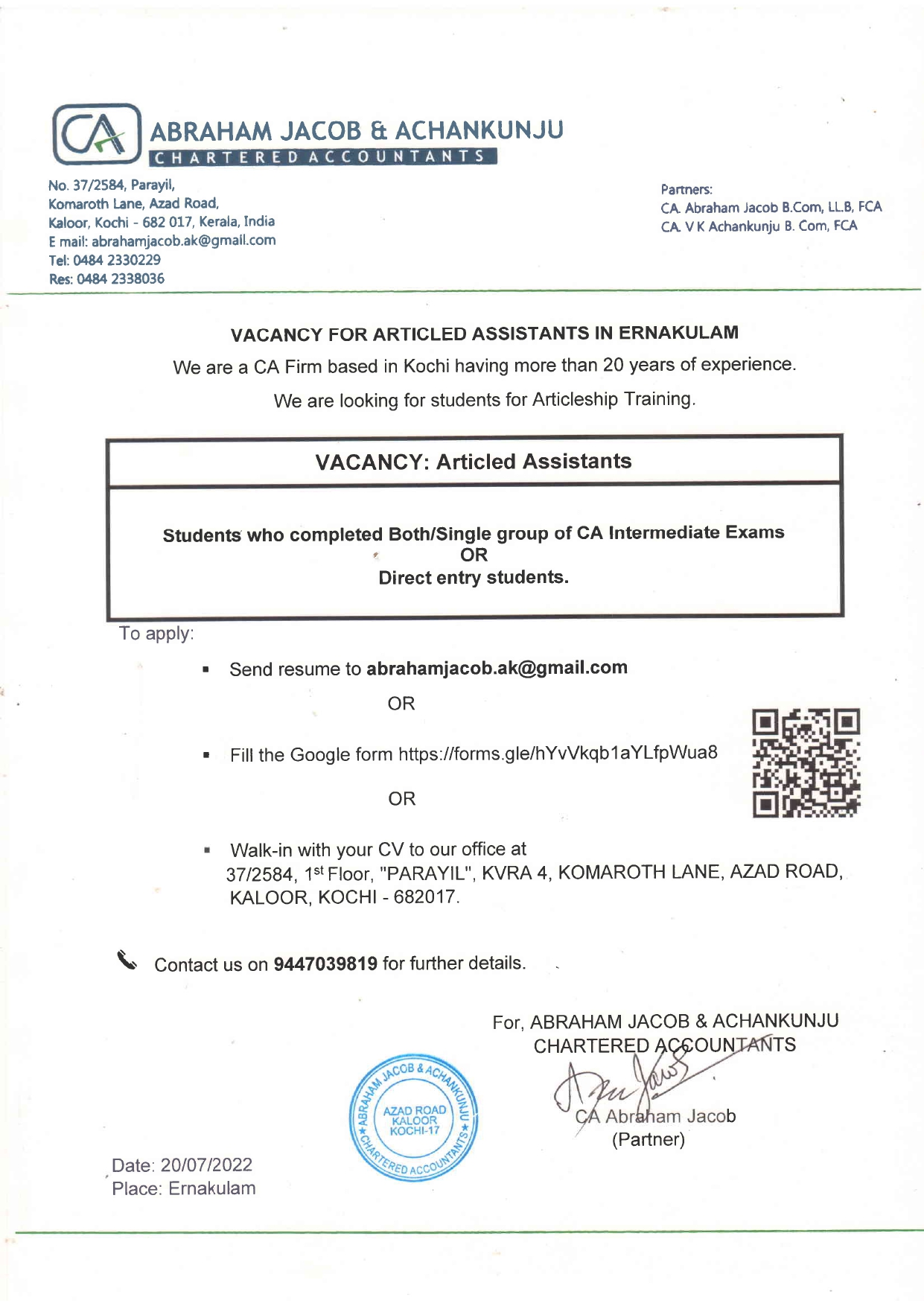 Vacancy for Articled Assistant Company: Abraham Jacob & Achenkunju Members 862 Views Company/Firm: Abraham Jacob & Achenkunju Ernakulam @ Download File Category Members Share this Post