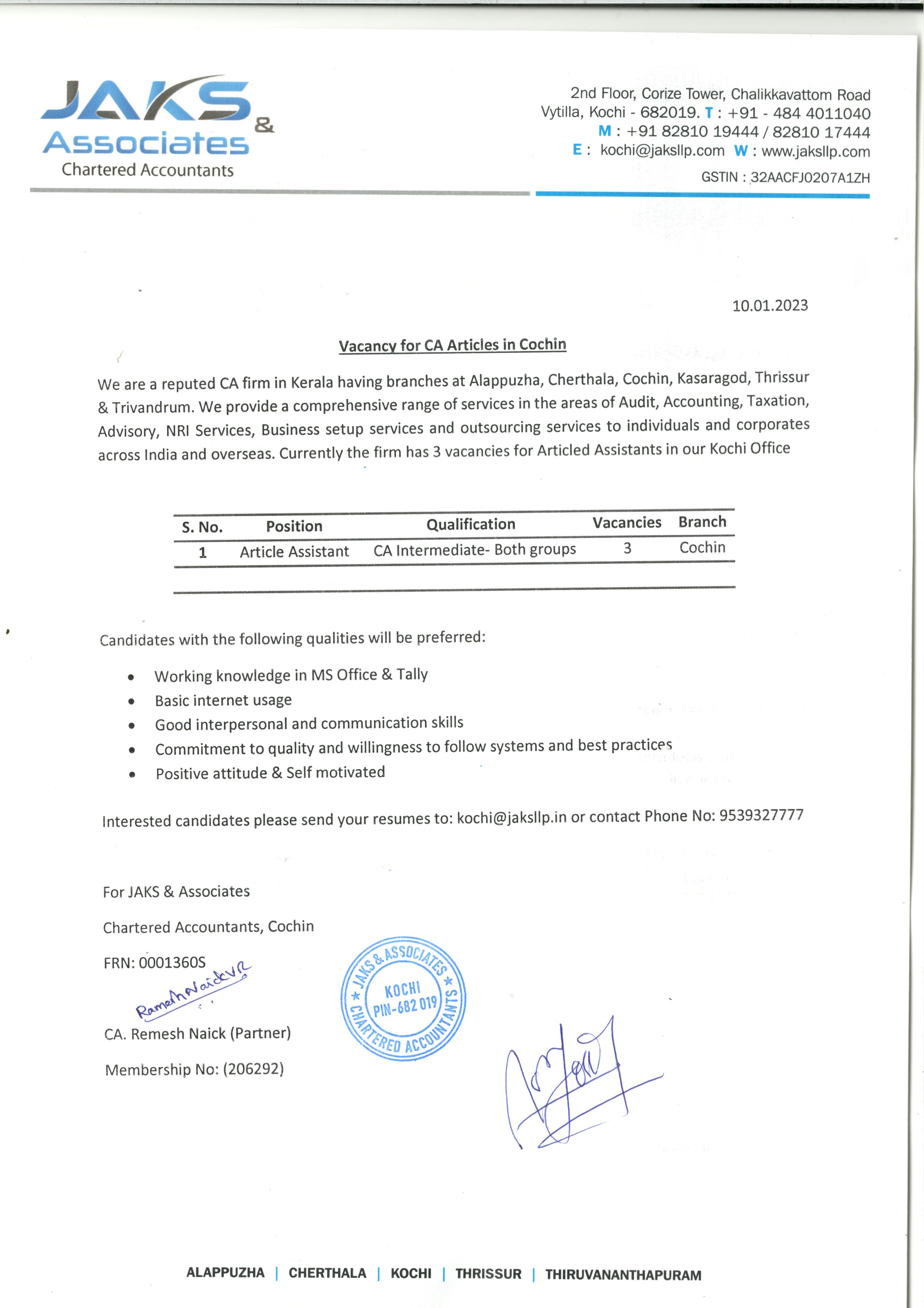 Vacancy for Articleship Company: JAKS & Associates Members 1349 Views Company/Firm: JAKS & Associates @ Download File Category Members Share this Post
