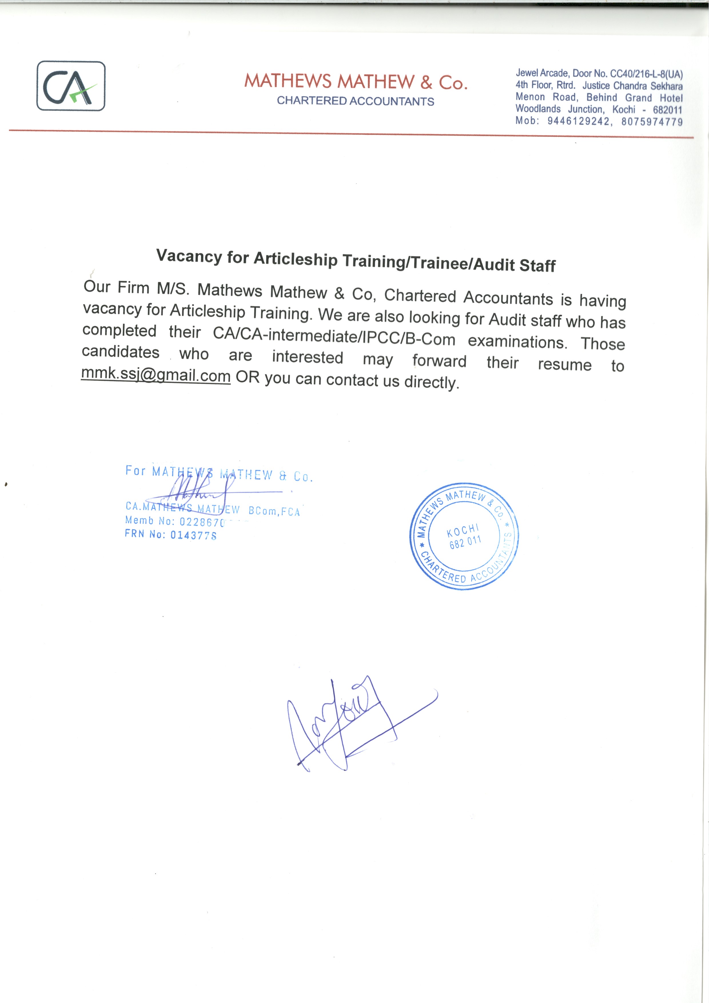 Vacancy for Articleship Company: Mathews Mathew & Co Students 892 Views Company/Firm: Mathews Mathew & Co @ Download File Category Students Share this Post