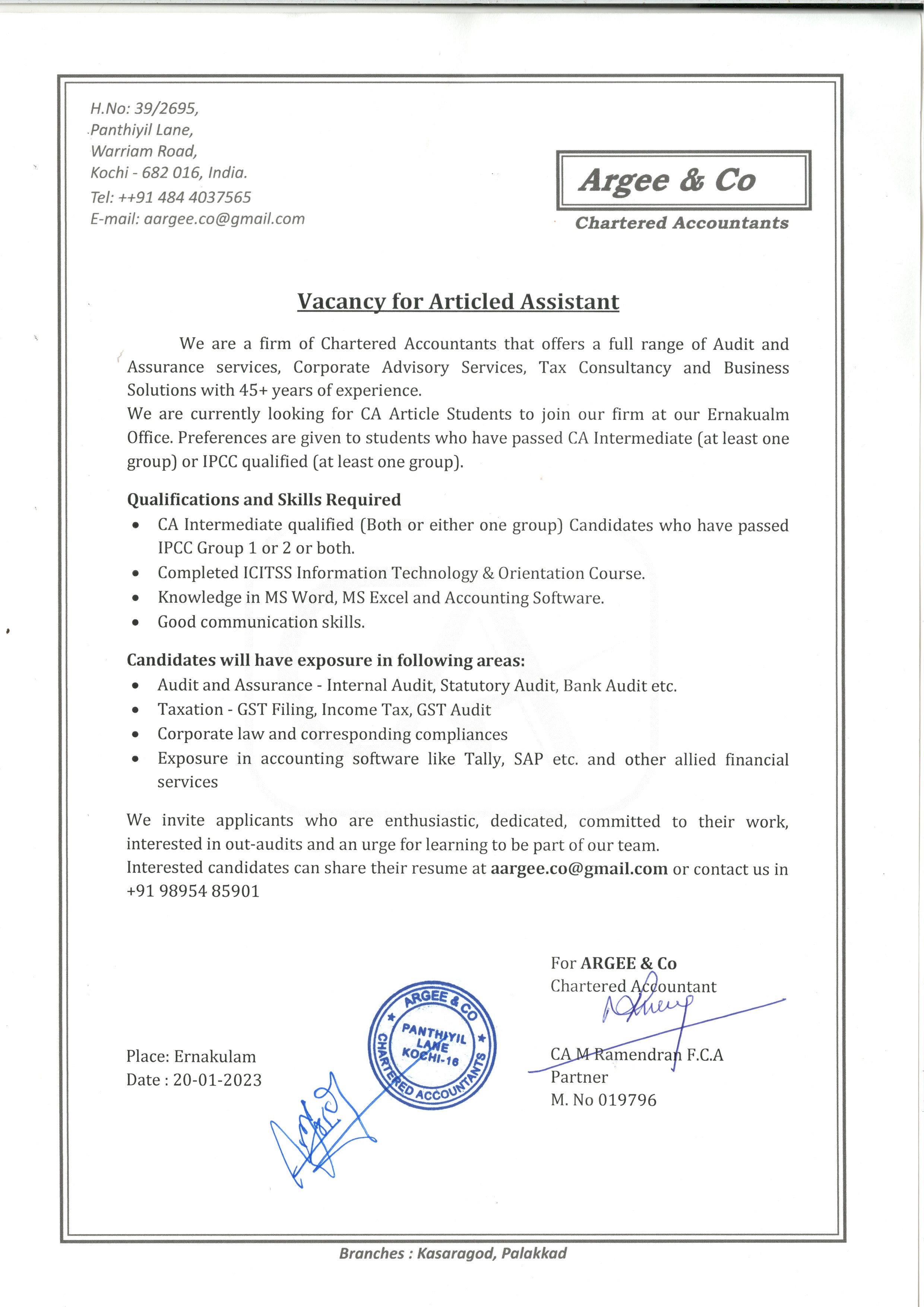 Vacancy for Articled Assistant Company: Argee & Co Members 1148 Views Company/Firm: Argee & Co @ Download File Category Members Share this Post