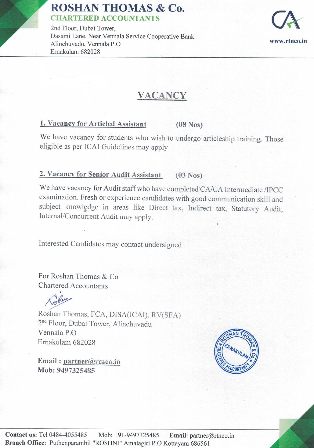 Vacancy for Articled Assistant & Audit Assistant Company: Roshan Thomas & Co Students 1094 Views Company/Firm: Roshan Thomas & Co @ Download File Category Students Share this Post