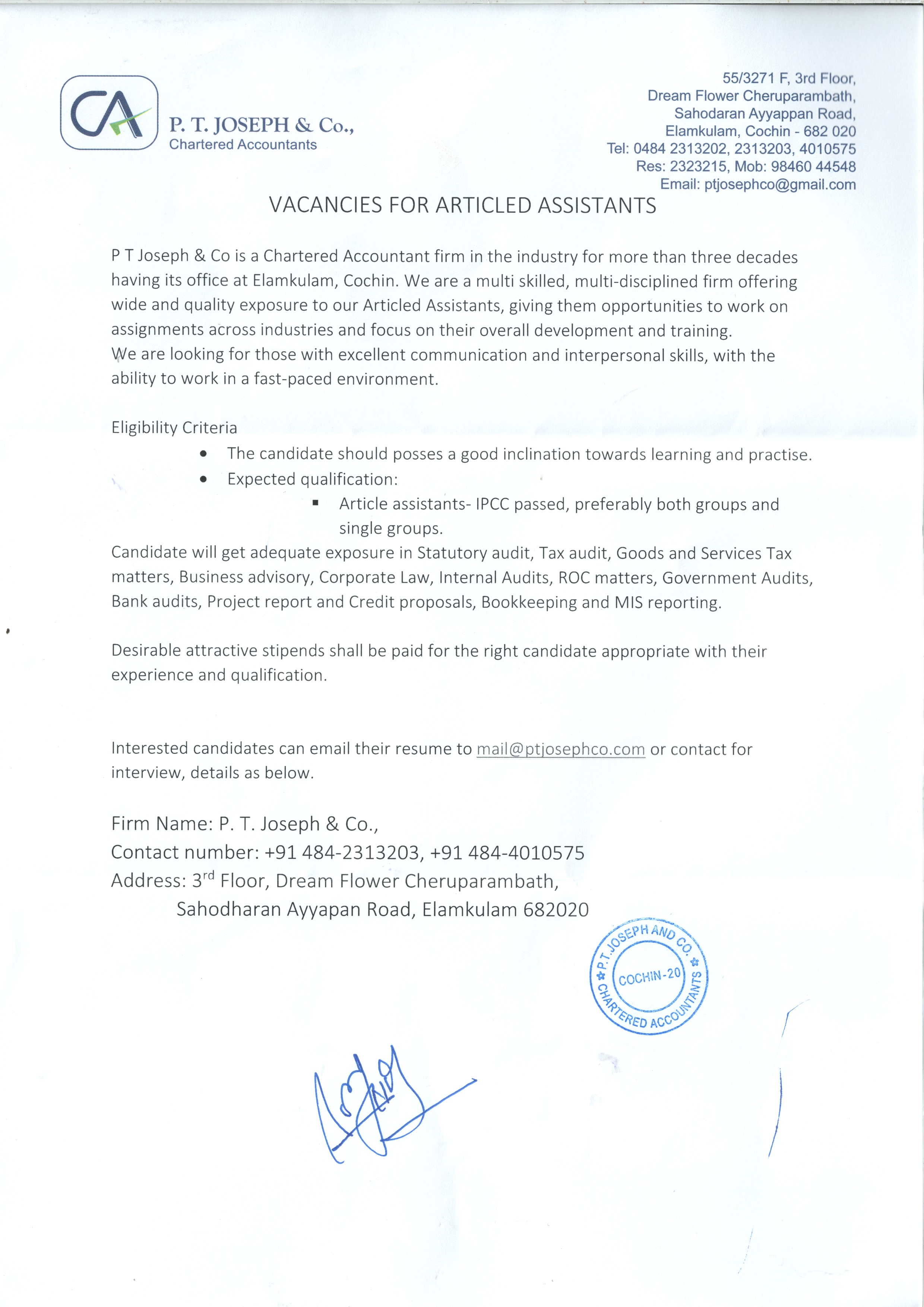 Vacancy for Articled Assistant Company: P T Joseph & CO., Students 1157 Views Company/Firm: P T Joseph & CO., @ Download File Category Students Share this Post