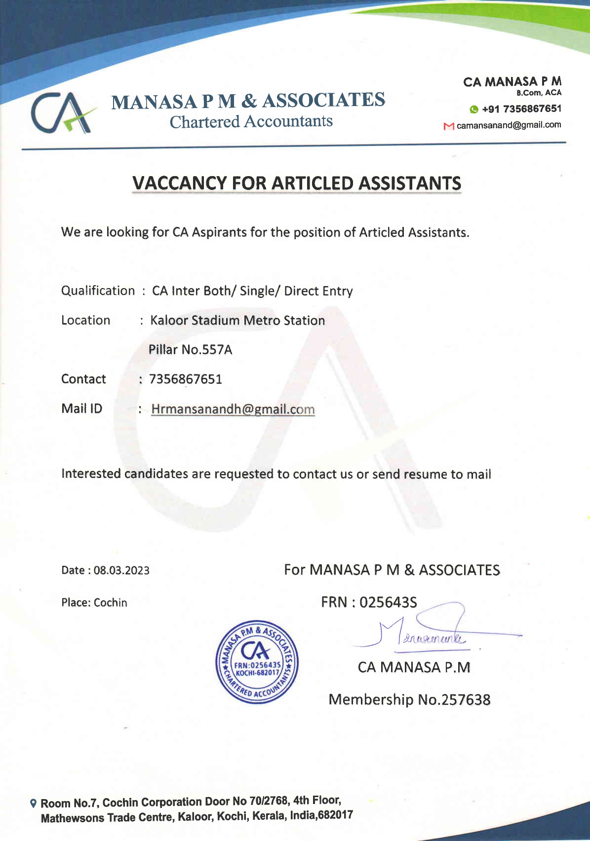Vacancy for Articled Assistant Company: Manasa P.M & Associates Students 1418 Views Company/Firm: Manasa P.M & Associates @ Download File Category Students Share this Post