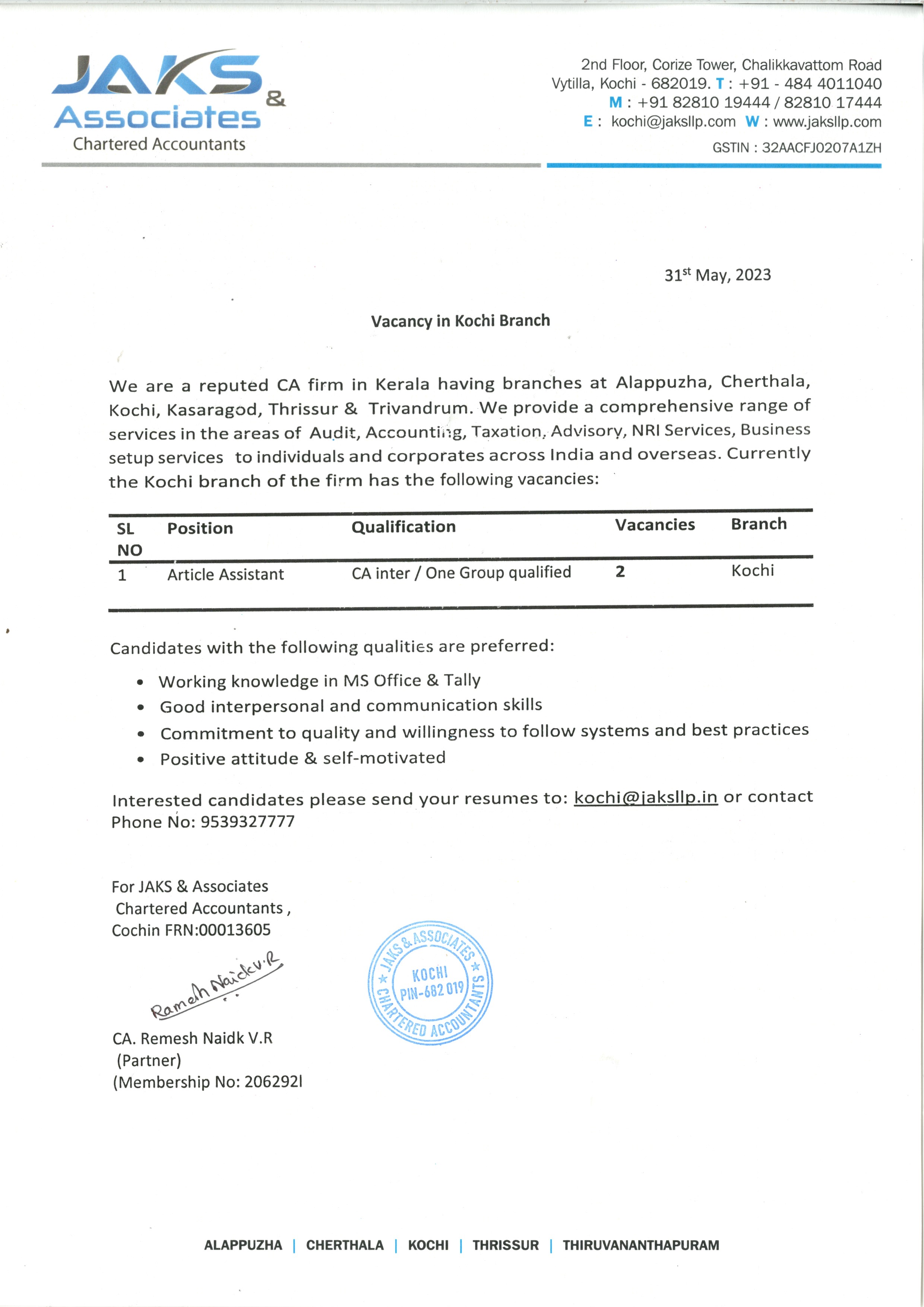 Vacancy for Articled Assistant Company: JAKS & Associates Students 1102 Views Company/Firm: JAKS & Associates @ Download File Category Students Share this Post
