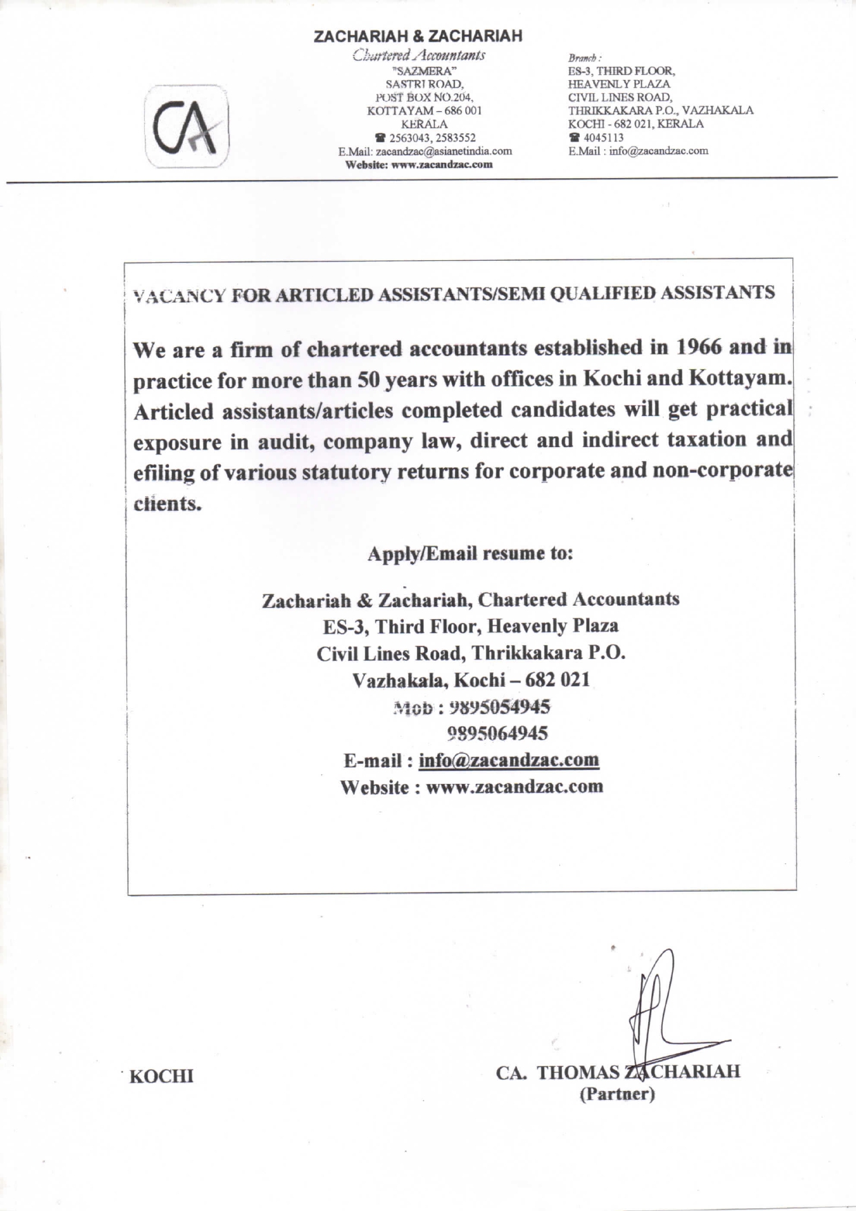 Vacancy for Articled/Semi qualified Assistants Company: Zachariah & Zachariah Students 774 Views Company/Firm: Zachariah & Zachariah @ Download File Category Students Share this Post