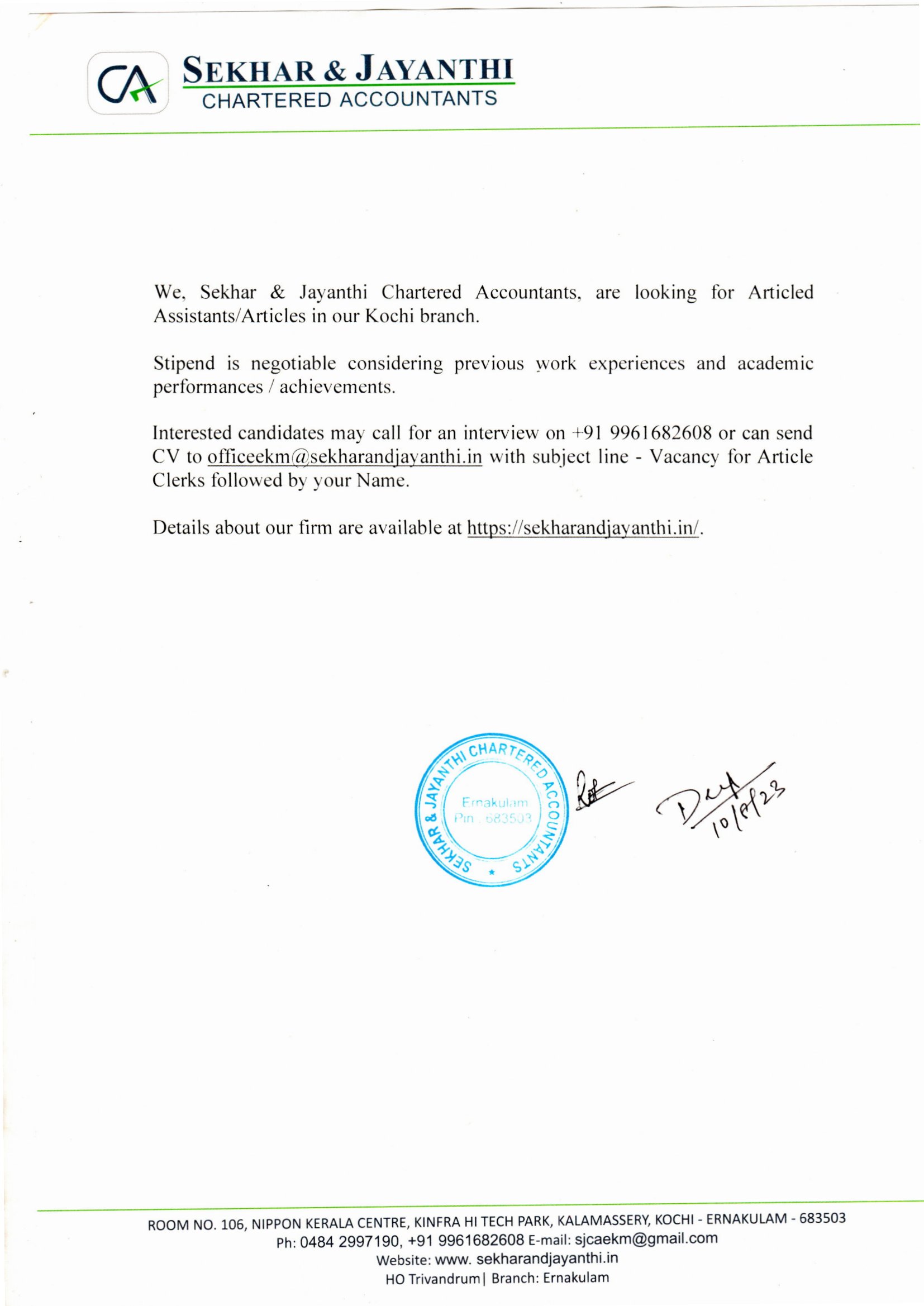 Vacancy for Articled Assistant Company: Sekhar & Jayanthi Members 710 Views Company/Firm: Sekhar & Jayanthi @ Download File Category Members Share this Post