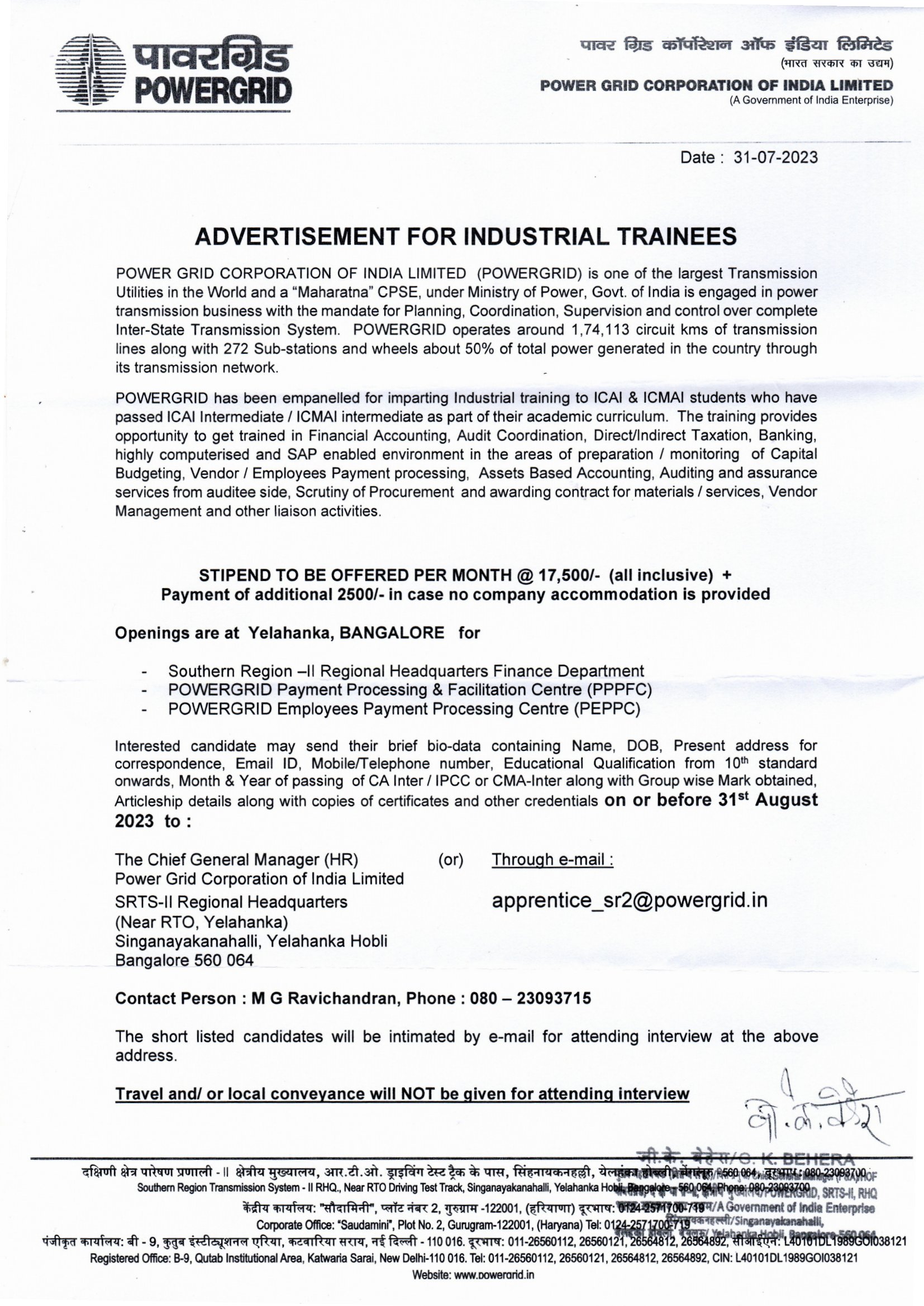 Industrial Trainee- Vacancy- Power Grid Corporation Company: Power Grid Corporation Students 916 Views Company/Firm: Power Grid Corporation @ Download File Category Students Share this Post