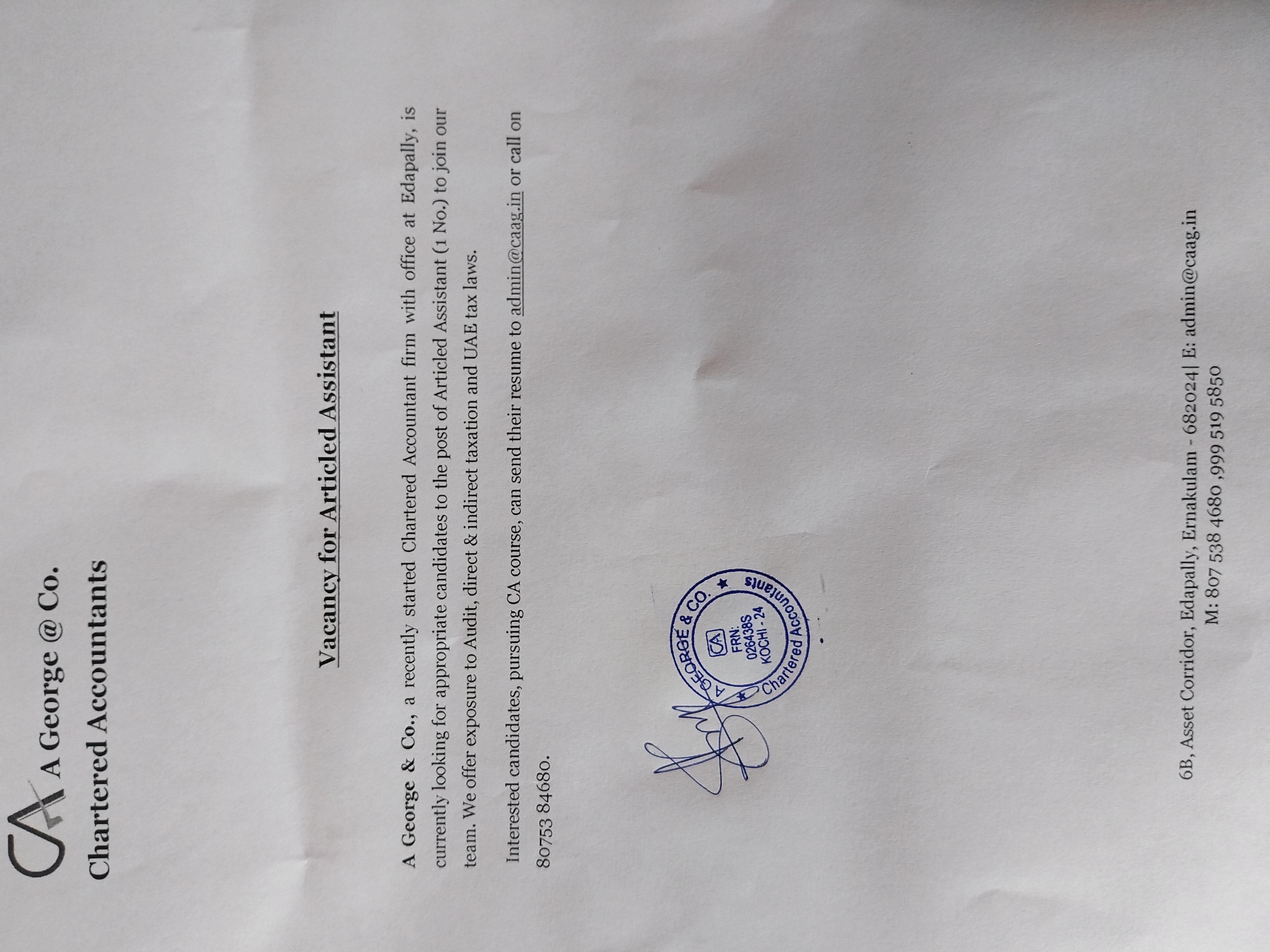 Vacancy for Articled Assistant Company: A George & CO Students 773 Views Company/Firm: A George & CO @ Download File Category Students Share this Post