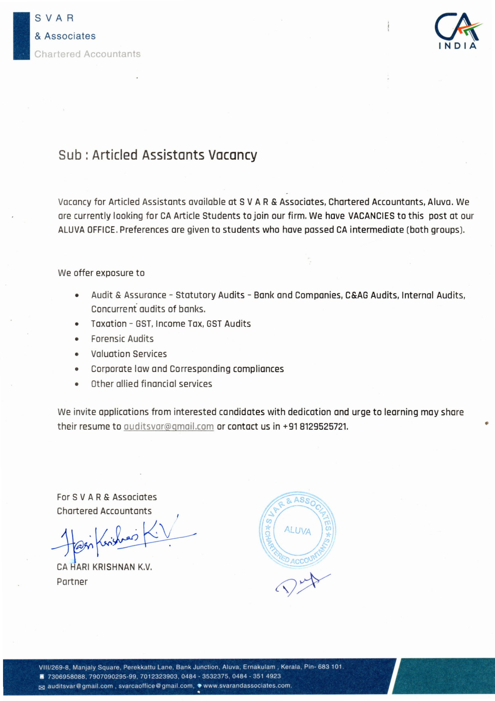 Vacancy for Articleship Company: SVAR Students 609 Views Company/Firm: SVAR @ Download File Category Students Share this Post