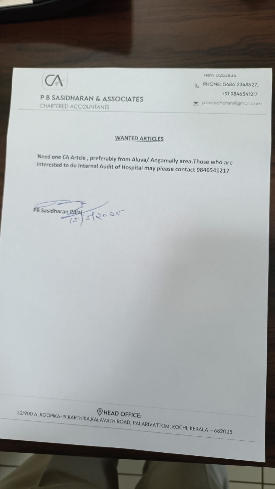 Vacancy for Articleship Company: P B Sasidharan & Associates Students 342 Views Company/Firm: P B Sasidharan & Associates @ Download File Category Students Share this Post