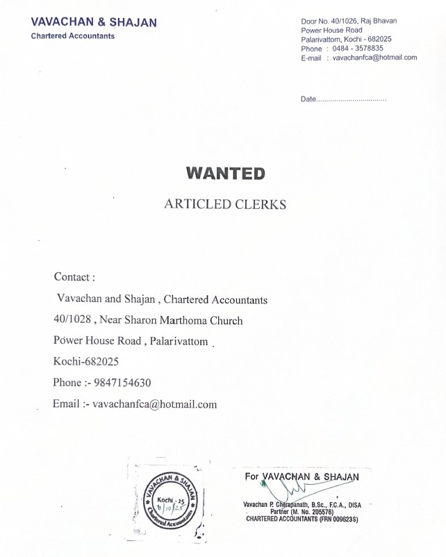 Vacancy for Articleship Company: Vavachan & Shajan Members 273 Views Company/Firm: Vavachan & Shajan @ Download File Category Members Share this Post